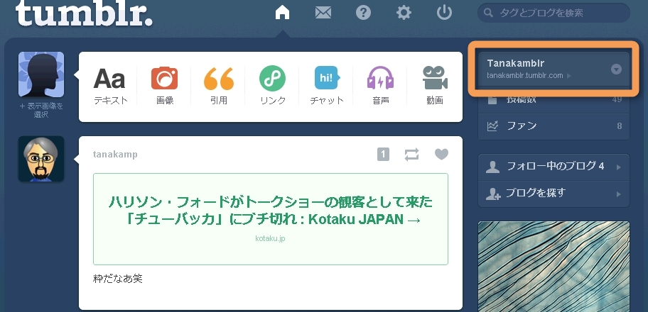 Tumblrではアカウントを作った時に最初に作成するブログをメインブログ、それ以降に追加したブログを追加ブログと呼んでいる。