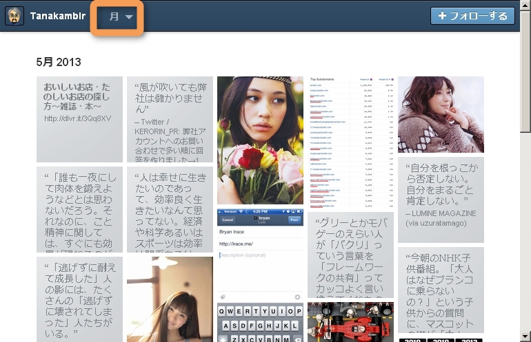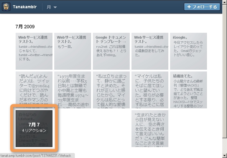 さてあなたのTumblelog最初の投稿はどんなものだろうか。それを読んでどう思うかは、当時のあなた、そして今のあなた次第。