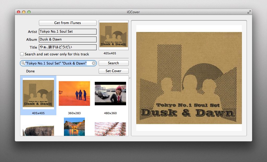 するとiGCoverが自動でアルバム名、アーティスト名を元にインターネット検索をかけて、画像検索結果を表示してくれる。