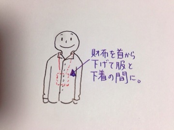 私はいつも海外旅行ではお金、クレジットカードパスポートなどは首からぶら下げた財布に入れ、服と下着の間にぶら下げるようにしている。