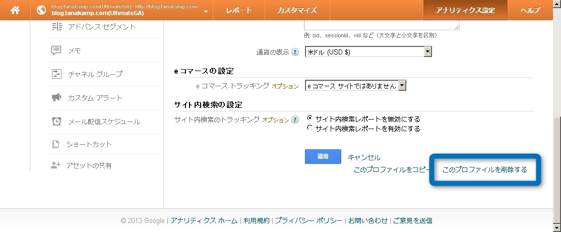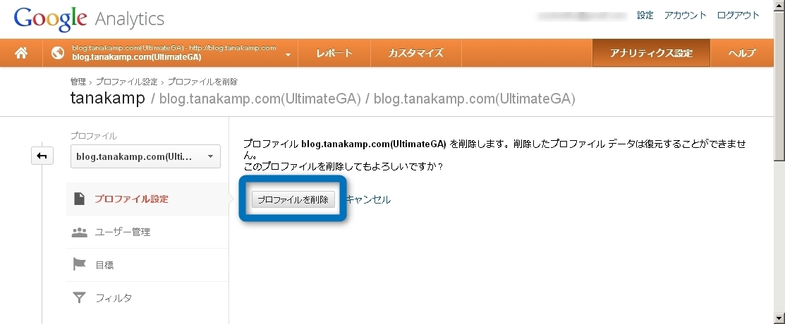私も「Analyticsコード二重埋め込みで10万PV達成ドヤ顔事件」なんてものがあったので、このブログに別のAnalyticsコードを仕込んで試したことがあったのだが、今は一本に絞っているので余計なプロファイルは削除することとした。