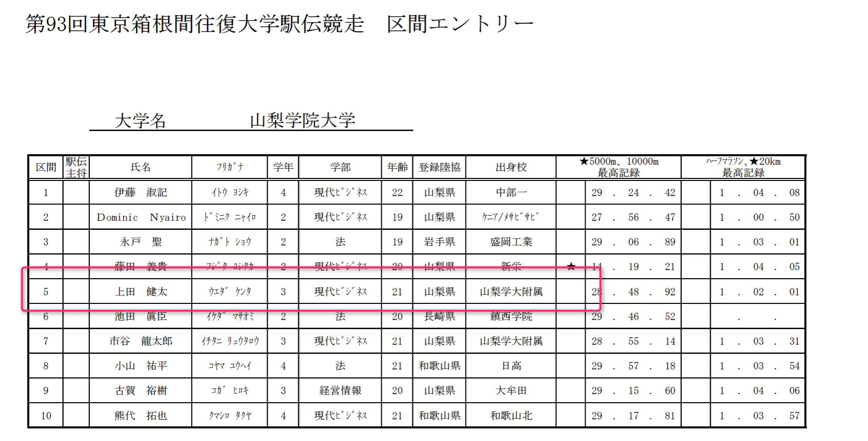 山梨学院大5区上田健太選手は上田誠仁監督の息子さん!【第93回(2017年)箱根駅伝区間エントリー】