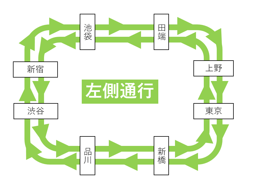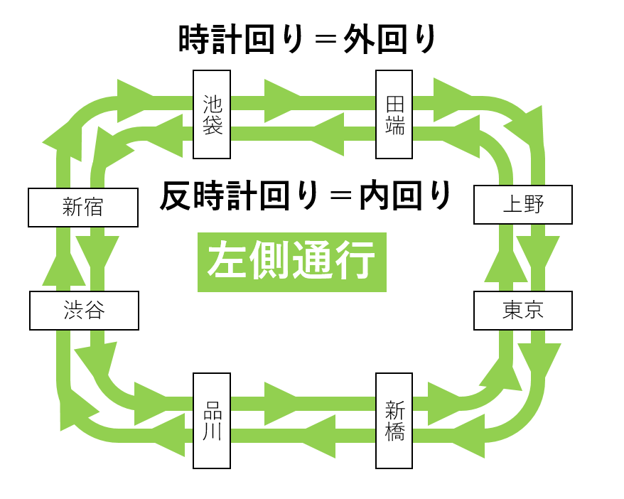 左側通行。日本国内では車がそうですが、山手線にもこれが当てはまります。